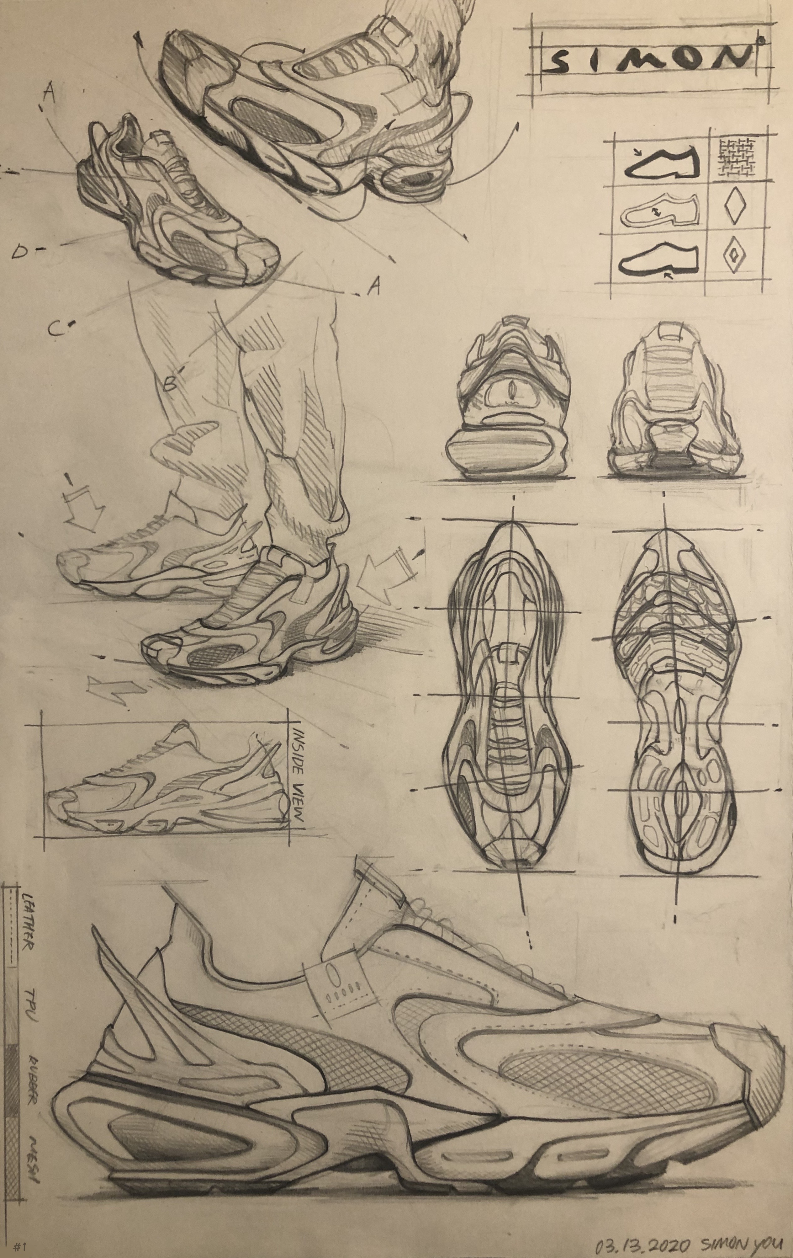 As an exchange student in the US, I continued creating artwork. My portfolio featured human figures and experimental drawings. Additionally, my interest in shoe design grew during my studies.