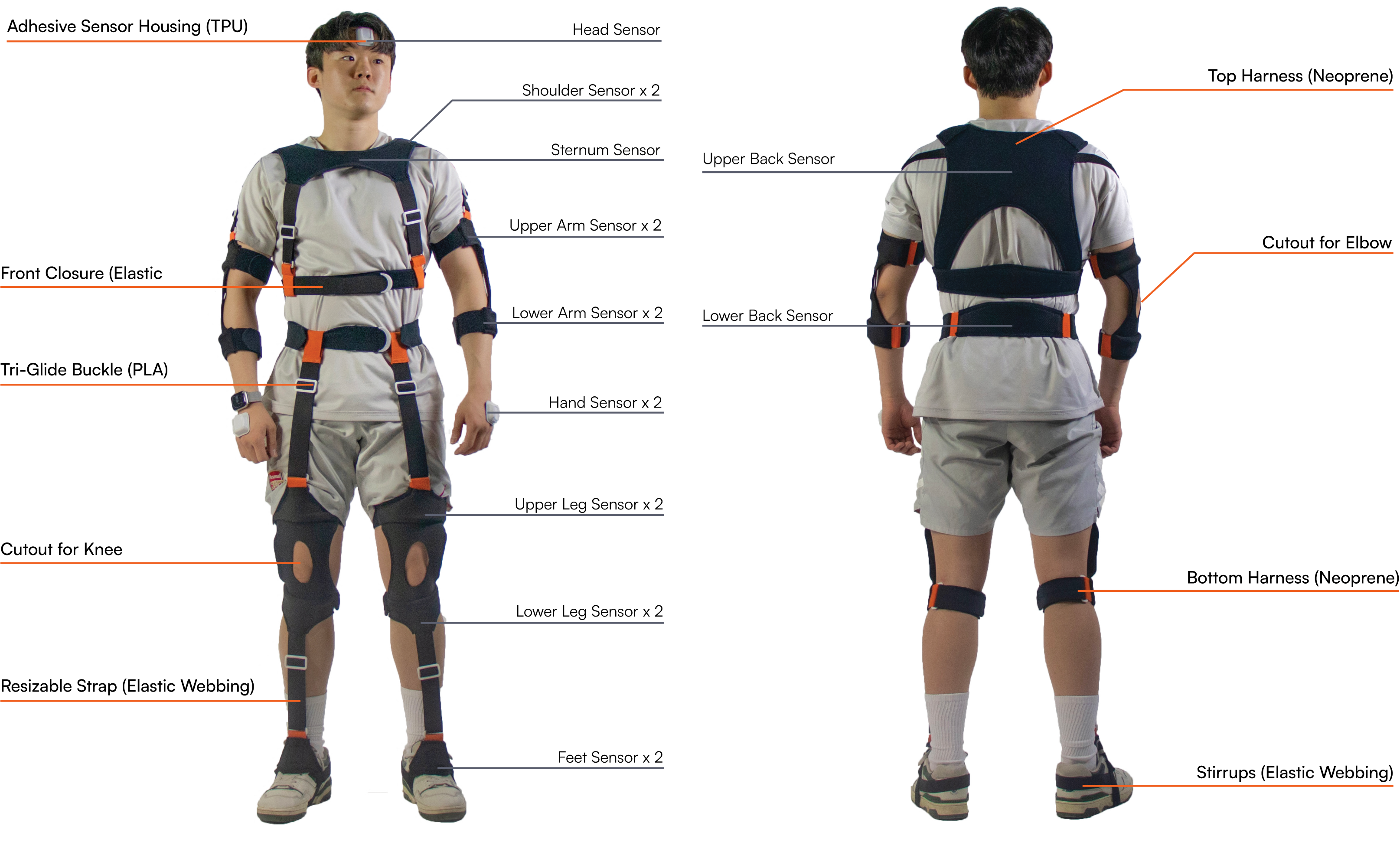We designed and fabricated a set of resizable harnesses that can hold 14 IMU sensors on the entire human body and three 3D printed TPU housings for head and hands.